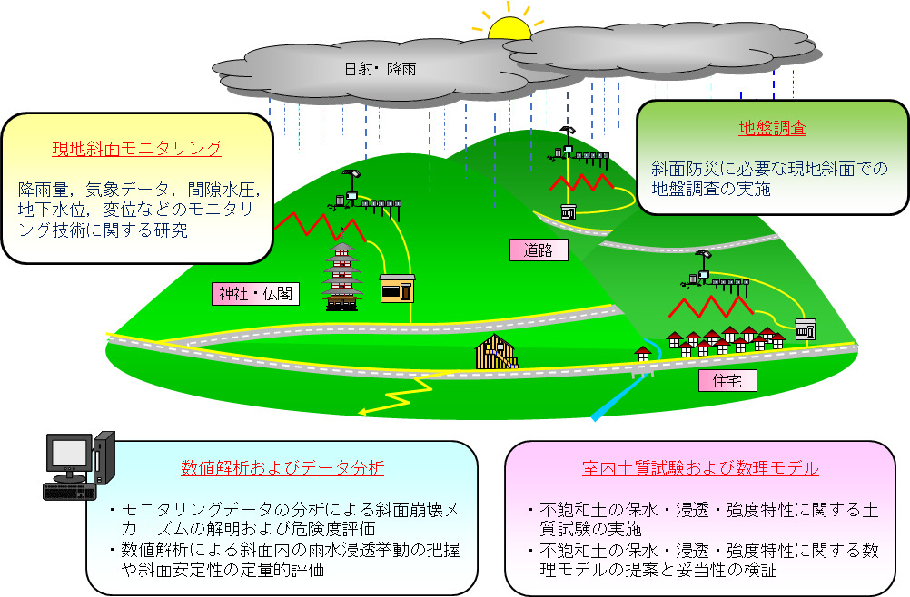 Update: 2019.07.01本研究室では,降雨時に表層すべり型斜面崩壊が発生する可能性の高い斜面において,「いつ」崩壊が発生するか予測するための防災システムの構築を試みています。この研究は,地盤調査,現地斜面モニタリング,数値解析,機械学習などのデータ分析,室内土質試験,室内土槽試験などの研究に取り組んでいます。